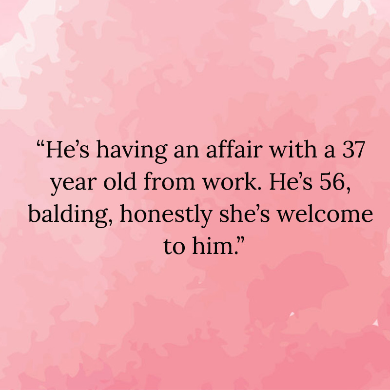 “He’s having an affair with a 37 yr old from work. He’s 56, balding…, honestly she’s welcome to him.”
